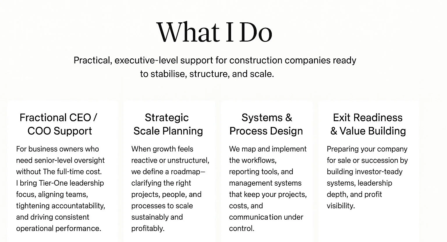 I work with contractors and specialist subcontractors who’ve built strong reputations but know their internal systems, processes, or management rhythm haven’t caught up with their growth.